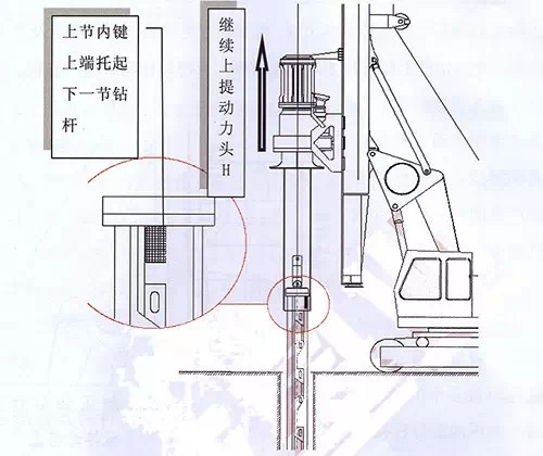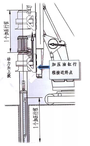 5.一個工作循環(huán)結(jié)束,重復(fù)循環(huán),直至成孔。(經(jīng)多個工作循環(huán)后,加壓油缸行程接近終點時,應(yīng)將加壓油缸向上拉起約一個加壓行程,以便快速找到鉆桿的下一個加壓鎖點,繼續(xù)向下鉆進(jìn))。