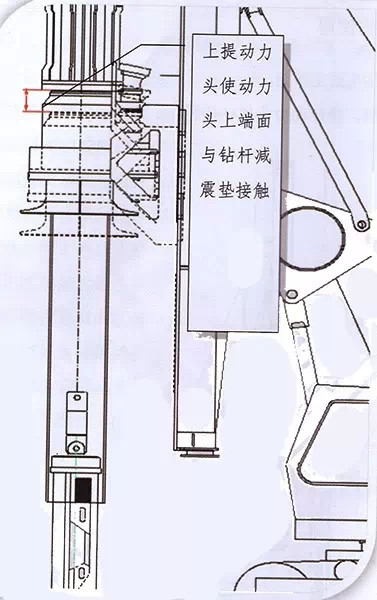 (1)上提動力頭使動力頭上端面與鉆桿減震墊接觸釋放加壓油缸加壓力。